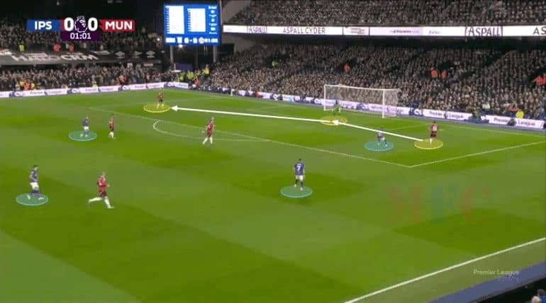 Ипсвич хэрхэн ойрын жигүүрт хэт их төвлөрсөн байгааг хараарай — шигшээ талбайн өргөний гадна таван тоглогч, дотор нь гурав. Энэ нь эсрэг талд сул орон зай үлдээсэн тул Далот бөмбөгийг дотогш төвийн хамгаалагч Мазрауи руу шидэж, тэр нь дараа нь бөмбөгийг Амад руу дамжуулсан. Амад сул орон зайд дахин бөмбөг хүлээн авсан байв.